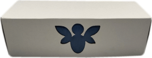 Avec calage intérieur, ouverture évasée pour mieux montrer le produit et papier coloré façon cuir bleu.